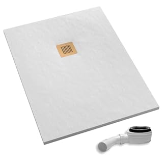 AQUABAD Duschwanne/Duschtasse Palast mit LeakProtect Technologie White Stone 90x110cm Rechteck – Blende: poliertes Kupfer | inkl. Ablaufgarnitur/Siphon
