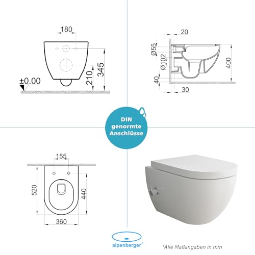 LIEFERUMFANG: Komplettset leer Wand WC und WC Sitz. Kloschüssel leer Keramik. 5 mm dicker Schallschutz Set inklusive. WC Set kompatibel mit Geberit. Die Abmessungen des WCs sind: 52 cm Lang, 36 cm Voll, 40 cm Hoch