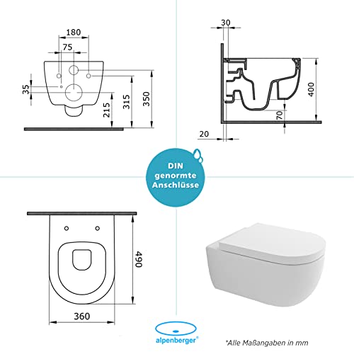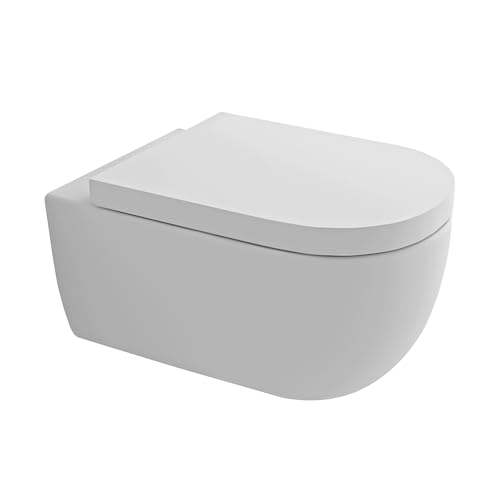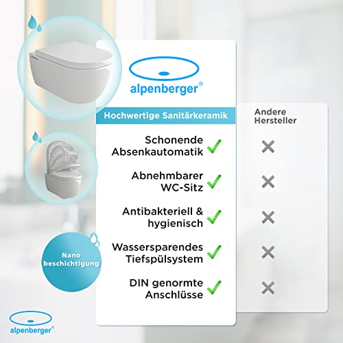 Alpenberger Hänge WC Spülrandlos Toilette | Keramik Wand WC Toilettendeckel mit Absenkautomatik | Nano Beschichtung Gäste WC Toilettenschüssel | Kloschüssel Passend Geberit (Aquanet 9100)