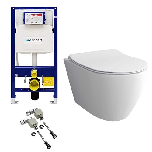 LIEFERUMFANG: Hänge WC Komplettset mit Geberit UP320 Spülkasten und Bausatz + WC Sitz mit Absenkautomatik Soft Close. Die Abmessungen des WCs sind: 51,5 cm Lang, 36 cm Voll, 40 cm Hoch
