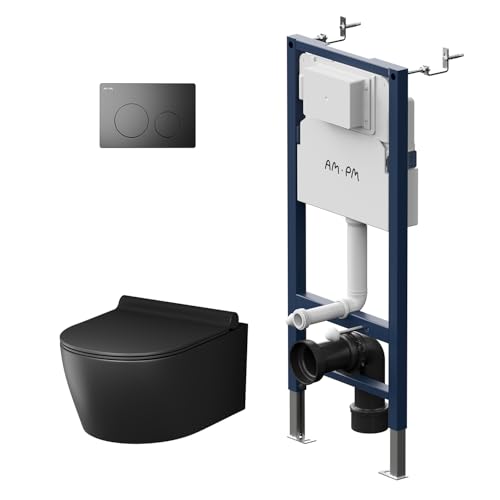AM.PM – Hänge WC Komplettset, Vorwandelement WC Set Komplett Vormontiert (Prime Fit) + Spülrandlos Wand-WC Schwarz (X-Joy S) + Drückerplatte + WC-Sitz mit Absenkautomatik, Toilette Komplett Set