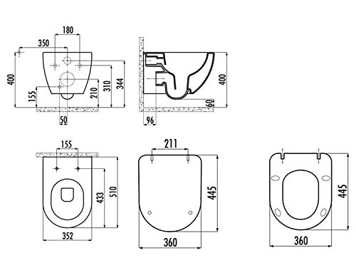 MAßE: 510 mm lang x 352 mm blau x 340 mm hoch (ohne Deckel), Tiefspüler WC mit Toilettensitz, Wandmontage von oben, Sitz ist abnehmbar (ideal zur Reinigung), D-Form, Farbe: Weiß, Material: Keramik