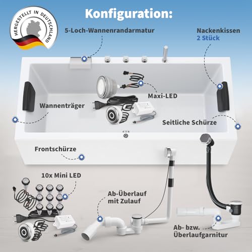 AQUADE Acryl Badewanne 190×90 cm Modell: Wolfsburg Hergеstellt in Dеutschland Badewannen Komplettset – Wählen Sie Ihre perfekte Wanne: Ab-Überlauf mit Zulauf, Wannenrandarmatur, Nackenkissen, LED