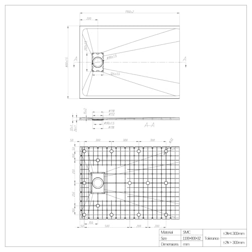Produktgröße: 1100 x 800 x 32 mm, entworfen für Nassräume und begehbare Duschabtrennung
