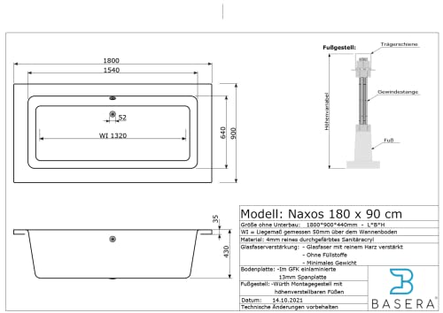Basera® Classic Indoor Whirlpool Badewanne Naxos mit 24 Massagedüsen, Wasserfall, LED-Ambiente, Touchpanel, Bluetooth und Radio (180 x 90 x 62 cm)