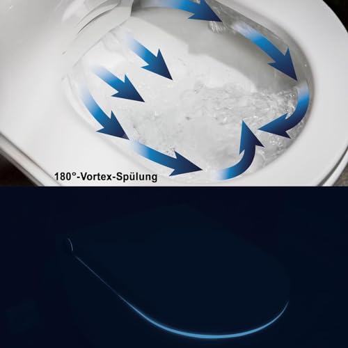 Wahlmöglichkeit Ausstattung: 180°-Vortex-Spülsystem, spülrandloses WC, Soft-Close-Sitz, Nachtlicht. Düse mit antibakterieller Beschichtung. Einfach abnehmbar statt Reinigung