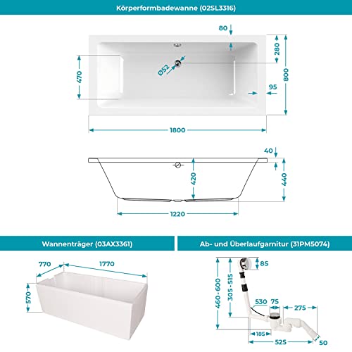 ✅ BADEWANNE KOMPLETTSET: • Rechteckbadewanne • Maße: 180 x 80 cm • Höhe: 42 cm • 230 l Fassungsvermögen • 127 cm Liegefläche • Langlebig • Farbecht • Pflegeleichte Oberfläche • Isolierender Wannen-Träger • Ablaufgarnitur