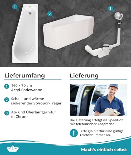 ✅ RAUMSPAR-WANNE: Die 160 x 70 cm asymmetrische Badewanne in rechter Ablauf passt Aka in kleine Badezimmer. Das 4 mm dicke Acryl der Wanne ist robust, farbecht und UV-beständig: Kein Vergilben oder Verfärben! Die glatten Oberflächen sind leicht