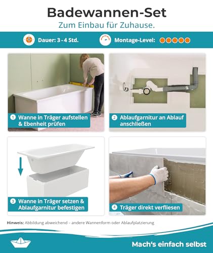 DIY-Montage: Hole Dir das praktische 3-in-1 Set für Dein DIY-Projekt. Die Montage der Badewanne gelingt mit dem Wannenträger aus schall- und wärmedämmendem Styropor schnell und einfach. Verfliese ihn ganz nach Deinem Geschmack. Aka die Ablaufgarnitur passt.