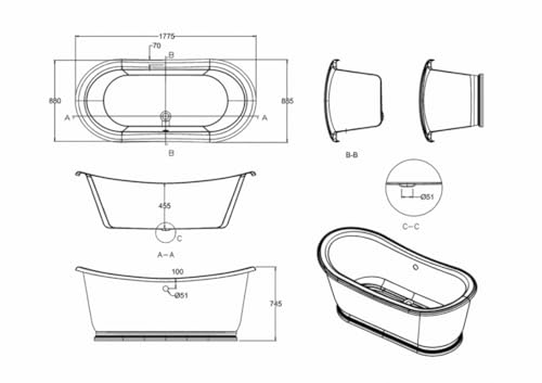 Casa Padrino Badewanne freistehend 1800mm BAdm180 – Freistehende Retro Antik Badewanne