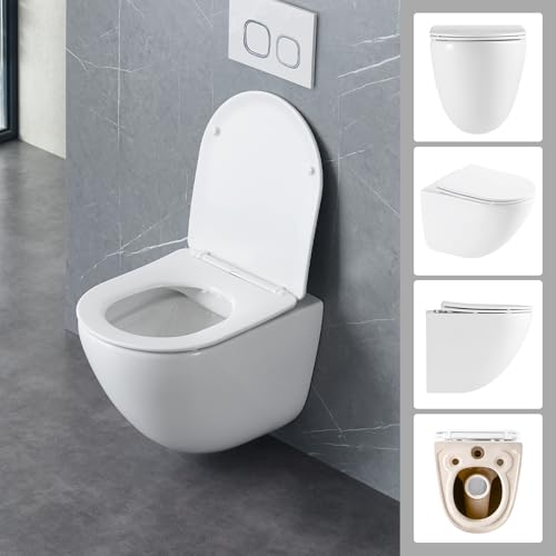 CLEANMAN Spülrandloses Hänge-WC, Wand-Toilette, Hänge-WC aus Keramik mit Slim-WC-Sitz Absenkautomatik, Tiefspül-WC,Weiß,B: 365 H: 375 T: 495 mm