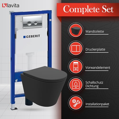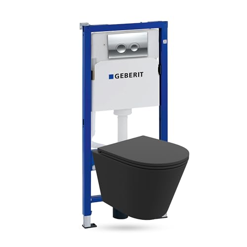KOMPLETT-PAKET: Geberit Duofix Basic Vorwandelement + Wand-WC Tiefspül Galve Becken Schwarz Spülrandlos + Bedienplatte Delta 25 für Doppelspülung