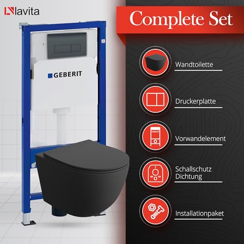 KOMPLETT-PAKET: Geberit Duofix Basic Vorwandelement + Wand-WC Tiefspül Sinto Becken Schwarz Spülrandlos + Bedienplatte Delta 25 für Doppelspülung
