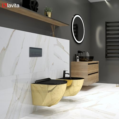 KOMPLETT-PAKET: Geberit Duofix Basic Vorwandelement + Wand-WC Tiefspül Sofi Slim Becken Gold/Black Spülrandlos + Bedienplatte Delta 25 für Doppelspülung