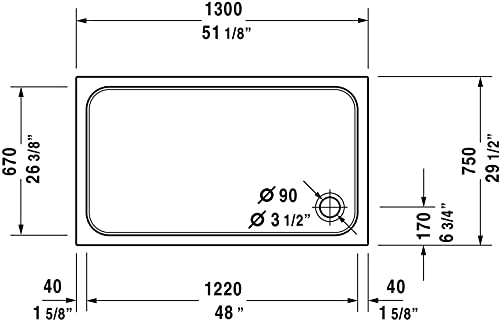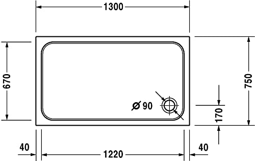 * Duravit D-Code * 1 x Duschwanne * Einbauversion * Rechteckig * Material: Sanitäracryl * schlag- und stoßunempfindlicher Kunststoff, porenfreie Oberfläche * Maße (BxTxH): 1300x750x85 mm * Innentiefe 60 mm * Position Ablauf: Ecke (Eckablauf Ø90mm) * Optional mit Antislip – Rutschfestigkeitsklasse C