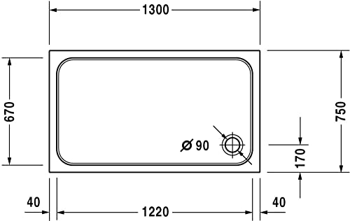 * Duravit D-Kennung * 1 x Duschwanne * Einbauversion * Kantig * Material: Sanitäracryl * schlag- im Übrigen stoßunempfindlicher Plaste, porenfreie Erscheinungsbild * Maße (BxTxH): 1300x750x85 mm * Innentiefe 60 mm * Ansicht Transaktion: Spitze (Eckablauf Ø90mm) * Optional qua Antislip – Rutschfestigkeitsklasse Kohlenstoff