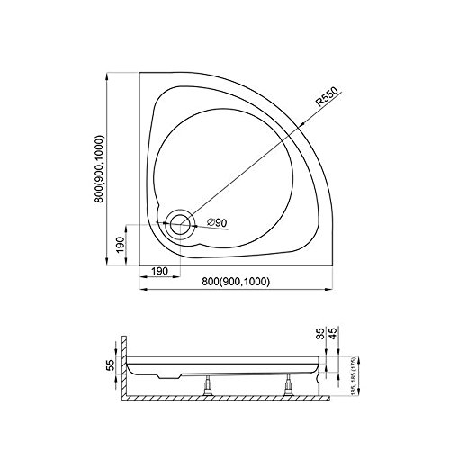 Duschwanne/Duschtasse Komplettset Nordona® SIMPLEX Plus | Maße: 90x90cm Viertelkreis R55 | Inklusive 4x Standfüße und einer Tempoplex Ablaufgarnitur