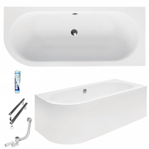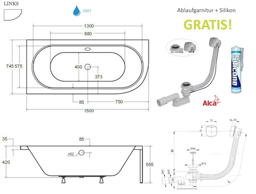 ✅🛁 𝗞𝗼𝗺𝗽𝗹𝗲𝘁𝘁-𝗦𝗲𝘁: Badewanne Avita Eckbadewanne 150×75 cm LINKS + Schürze jeder Acryl (1 Phase), Ablaufgarnitur Automatik Alcaplast, Silikon, Füße, Montagematerial.