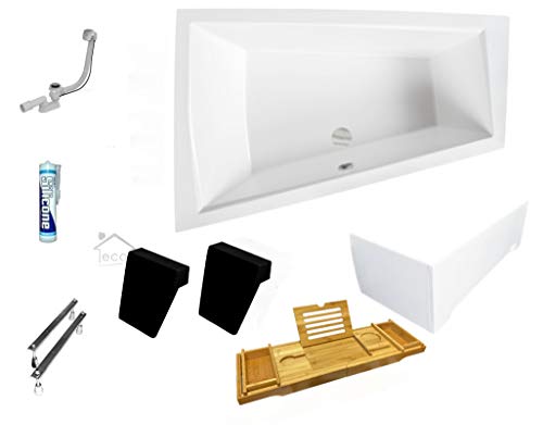 ECOLAM® Badewanne Intima Duo Eckwanne für Zwei 170×125 cm LINKS + Ablage Bambus + Schürze aus Acryl + 2x Kopfstütze Ab- und Überlauf Automatik Füße Silikon Komplett-Set – PERFEKT FÜR ZWEI PERSONEN