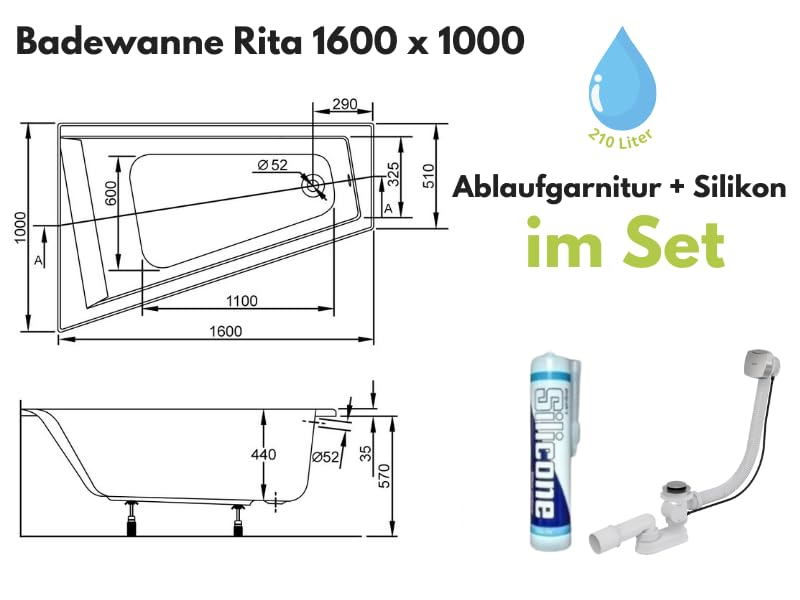 🛁 𝗞𝗼𝗺𝗽𝗹𝗲𝘁𝘁-𝗦𝗲𝘁: Badewanne RITA 160x100cm LINKS Trapezwanne + Acrylschürze (2 Elemente) + Badewannenbrett + Ablaufgarnitur Automatik Alcaplast, Silikon, Füße, Montagematerial