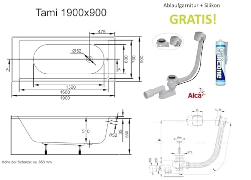 ✅🛁 𝗞𝗼𝗺𝗽𝗹𝗲𝘁𝘁-𝗦𝗲𝘁: große Badewanne TAMI Rechteckbadewanne 190 x 90 cm + Schürze aus Acryl (2 Elemente), Ablaufgarnitur Automatik Alcaplast, Silikon, Füße, Montagematerial.