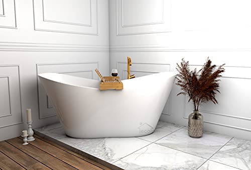 ECOLAM® exklusive freistehende Badewanne Standbadewanne + Ablage Bambus moderne Wanne freistehend Viya + Ablaufgarnitur Click Clack Design Mineralguss 160×70 cm glamour Luxus weiß