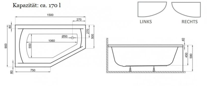 ✅ raumsparende Badewanne Eckwanne Selena 150×90 cm LINKS + Ablaufgarnitur Automatik Alcaplast, Silikon, Füße, Montagematerial