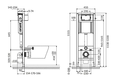 • einstellbare Einbautiefe 14-16 cm, Breite 41 cm, Höhe 113-133 cm