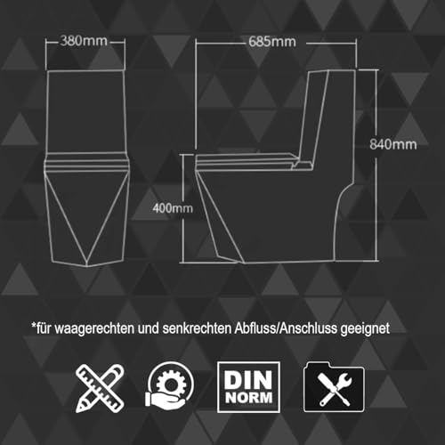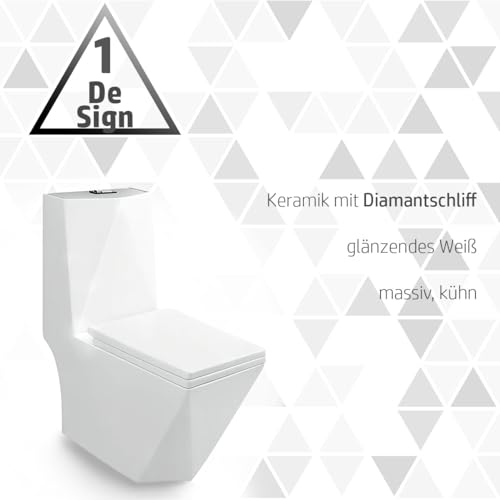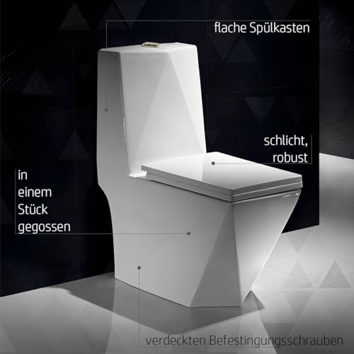 KOMFORTABLES DESIGN: Mit geformtem Prismoid-Design aus Diamantschliff-Keramik ist die minimalistische Toilette geeignet sowohl für große Badezimmer oder Gäste WC als auch für Luxus- und Kurhotels oder Restaurants; das einteilige WC mit eingebautem Spülkasten kann mit dem Waschbecken aus der gleichen Spalier kombiniert werden.