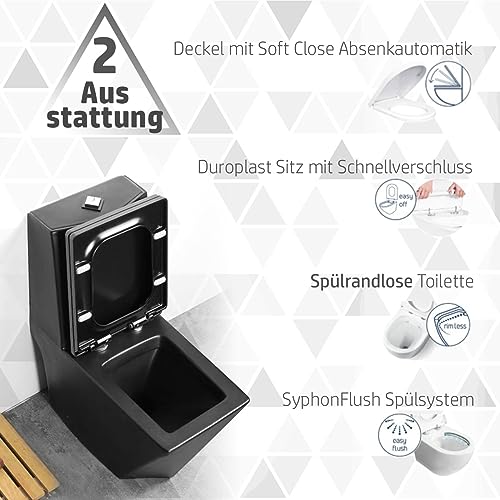 Die Toilette besticht durch makellose Qualität mit fein geschnittenen, glatten Kanten und zeugt vom Einfallsreichtum ihrer renommierten internationalen Designer bei der Schaffung eines wirklich einzigartigen Badezimmers. Die Toilette ist ideal sowohl für Wohngebäude als auch für Luxus- und Kurhotels, Restaurant-Badezimmer oder andere öffentliche Gebäude. Schlichtheit ist das Schlüsselelement für ein makelloses Badezimmer, in dem Perfektion hervorsticht. Das Toilettendesign und seine Funktionen machen es zur ersten Wahl. Da sie glasiert (emailliert) und bei 1200 Grad gebrannt wird, ist die Farbe äußerst beständig, wordurch sie absolut nie ausgewaschen, abblättert oder zerkratzt. Die verwendete Glasur wird direkt in der Produktionsfabrik entwickelt, jedes Produkt wird 3-4 Mal glasiert (emailliert), um sicherzustellen, dass die Schicht größer als 1,1 mm ist. Die Schutzschicht ist so glatt und fein, dass Wasser und Gefälle sehr leicht vonstatten gehen. Da sie relativ kompakt ist, passt sie perfekt in kleine Badezimmer, kann daher auch ein großes und luxuriöses Badezimmer aufwerten. Der Toilettendeckel ist leicht abnehmbar, wodurch eine einfach Reinigung möglich ist. Dank der schlanken Soft-Close-Absenkautomatik deduzieren Deckel und Brille zudem leise und sanft. Die spülrandlose Toilette sorgt für eine schnelle 360°-Spülung und weniger Reinigungsaufwand.