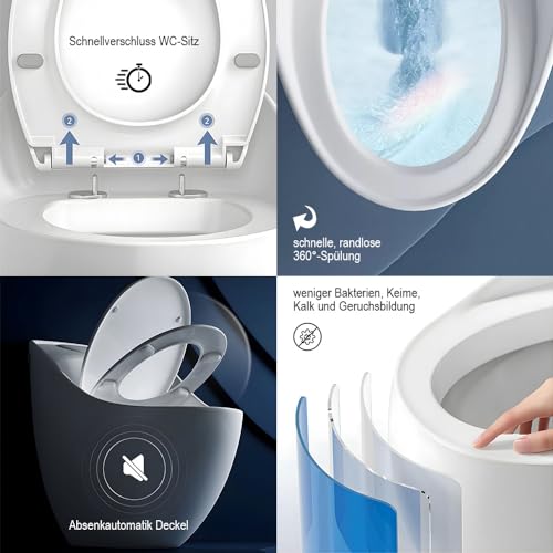 EFFIZIENZ: Sitz mit Absenkautomatik SoftClose-Ausbelichtung; Spülung mit zwei Geschwindigkeiten auf Knopfdruck; schnelles und leises Nachfüllen von Wasser; Energie- und Wassereinsparung; starke Spülkraft durch breite Rohre.