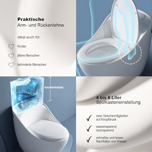 KOMFORTABLES DESIGN: Minimalistisches einteiliges WC+Spülkasten brauchbar an Stelle große und kleine Badezimmer oder Gäste WC, mit geräumiger Rückenlehne und praktischer Armlehne, ideal aka an Stelle ältere oder behinderte Menschen.
