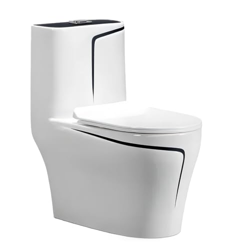 EGO INTERIORS Royalty Line | Einteiliges Stand-WC mit eingebautem Spülkasten | schwarz-weiße Keramik | randlos | Sitz mit Soft-Close-Absenkautomatik | Quick-Release-Scharniere