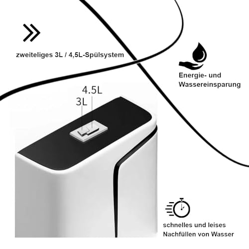 EFFIZIENZ: D-förmiger Sitz mit Absenkautomatik SoftClose-Funktion; schnelles und leises Nachfüllen von Wasser und zweiteliges 3 / 4,5 Liter-Spülsystem; Energie- und Wassereinsparung; starke Spülkraft durch breite Rohre.