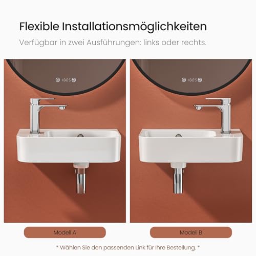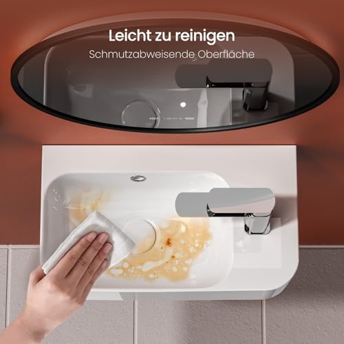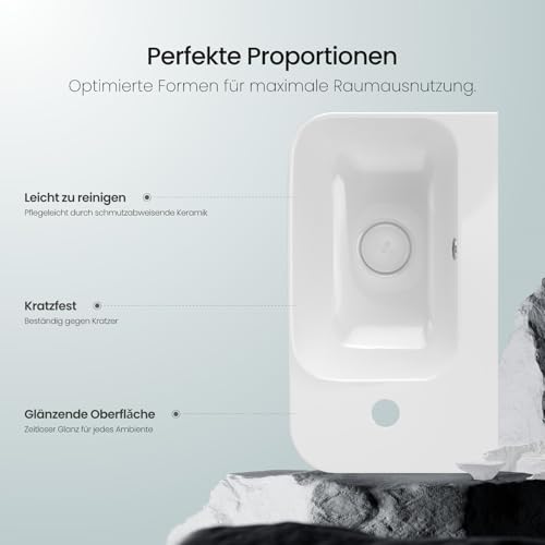 【Flexibler Wasserhahnanschluss】Das Waschbecken Bad ist mit einer rechtsseitigen Wasserhahnposition ausgestattet, sodass es sich optimal an verschiedene Badezimmerlayouts einsetzen lässt. Diese flexible Bauweise erleichtert die Installation und bietet mehr Freiheit bei der Raumgestaltung.