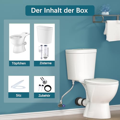 Findepot Stand WC mit Spülkasten komplett, WC mit schließendem WC-Sitz, WC-Becken mit waagerechtem Keramik-Ablauf, Ablauf hinten 38 cm hoch Toilette
