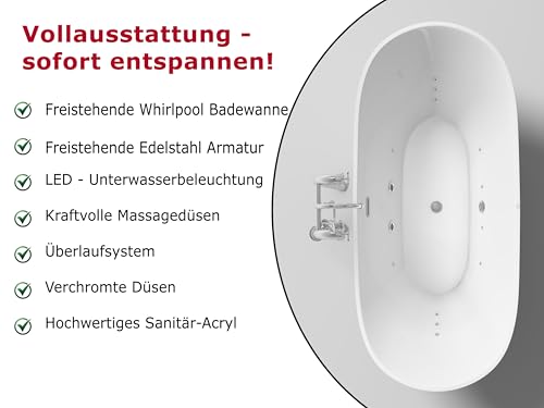 Mit eckiger Edelstahl-Armatur & praktischem Zubehör: Inklusive verchromter, freistehender Edelstahl-Armatur mit Handbrause (rund), Überlaufsystem, 40 mm Ablaufschlauch und flexiblen Anschlüssen – für eine unkomplizierte Installation. Gewicht: ca. 55 kg.