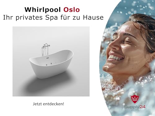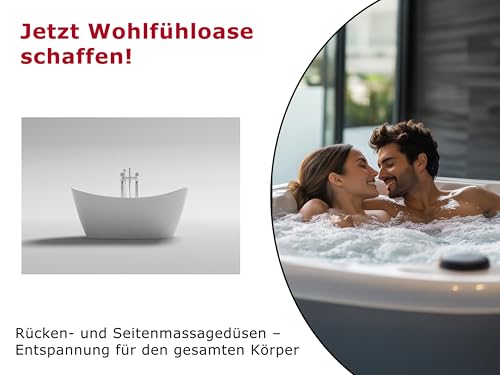 Großzügige Maße für zwei Personen: Die freistehende Whirlpool Badewanne Oslo misst 180 x 90 x 72 cm und bietet ausreichend Platz für entspannte Spa-Momente zu zweit – perfekt für Ihr Badezimmer oder den Wellnessbereich.