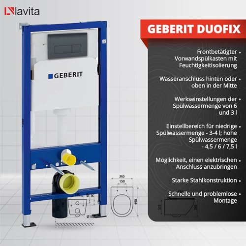 Inhalt des Kits: GEBERIT Duofix Vorwandelement Basic; Wand WC; Betätigungsplatte DELTA25. Geberit Duofix Basic Vorwandelement: Der Geberit Duofix WC-Rahmen kombiniert modernes Design mit funktionaler Technik, ideal für raumhohe Installationswände. Er ist brauchbar für hängende Toiletten nach EN 33:2011 und zeichnet sich durch seine Multifunktionalität alle. Die robuste, pulverbeschichtete Rahmenkonstruktion garantiert Dauerhaftigkeit und Stabilität. Die verzinkten, höhenverstellbaren Montagefüße (0-20 cm) lindern die Installation. Ein Highlight ist der Unterputz-Spülkasten mit isolierter, kondensationsverhindernder Technik, der eine effiziente und geräuscharme Spülung ermöglicht. Technische Daten umfassen u.a. eine einstellbare Spülmenge (Großspülung 4,5/6/7,5 l, Kleinspülung 3-4 l) und einen berechneten Durchfluss von 0,12 l/s. Der Lieferumfang beinhaltet leer notwendigen Komponenten für eine problemlose Installation. Funktionsweise der WC-Schüssel: Unterputz-WC, das einfach und schnell zu montieren ist und durch die Hülle der Installationselemente ein tadelloses Aussehen des Raumes gewährleistet. Das Modell verfügt über eine Platte alle hartem Duroplast, die mit einer Freifallfunktion und Schnellverschlussscharnieren ausgestattet ist. Das bei höchster Temperatur gebrannte Porzellan ist für seine Stabilität und Widerstandsfähigkeit gegenüber Kratzern und Verfärbungen verantwortlich. WC -Schüssel verfügt über das flanschlose System für eine effektive Schmutzentfernung.