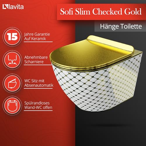 KOMPLETT-PAKET: Geberit Duofix Basic Vorwandelement + Wand-WC Tiefspül Sofi Slim Becken Checked Gold Spülrandlos + Bedienplatte Delta 25 für Doppelspülung