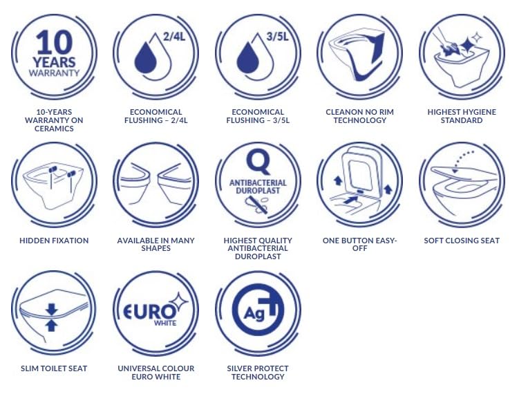 OVAL Hängebecken mit innovativer CleanOn-Technologie. Dank dieser Technologie werden alle Innenflächen des Beckens effektiv mit Wasser gespült und die Toilette bleibt länger sauber und hygienisch. Das Wandbecken zeichnet sich durch sein modernes Design aus. Es ist mit einem superdünnen SLIM WRAP-Sitz ausgestattet, dessen einfaches Design eine leichte Reinigung ermöglicht, während die innovative Ein-Knopf-Easy-Off-Auftrennung ein schnelles und einfaches Abklingen des Sitzes auf Knopfdruck erlaubt. Die Freifallfunktion sorgt dafür, dass das Brett allmählich abgesenkt wird, damit es nicht augenblicklich auf das Becken aufschlägt.