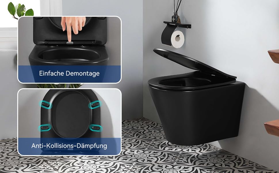 Unser schwarzes Hänge-WC ist aus hochwertiger Keramik gefertigt und in einem matten Finish gehalten, das nicht verblasst. Mit seinem modernen und schlanken Design wird es sicherlich zum Blickfang in Ihrem Badezimmer.