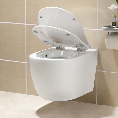 TOILETTE OHNE SPÜLRAND, STARK UND LANGLEBIG: Hochwertige Keramik wird bei 1280 ℃ hoher Temperatur kalziniert, ist rissfest, kratzfest und langlebig. Das Hänge WC ohne Spülrand ermöglicht eine Wasserführung in die ganze Toiletten Schüssel. Kehricht und Bakterien finden keinen Unterkunft.