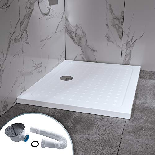i-flair Duschwanne 80×100 cm, flache Duschtasse aus langlebigem Sanitäracryl mit Anti-Rutsch-Noppen inkl. Ablaufgarnitur mit Geruchsverschluss (Siphon) – Weiß