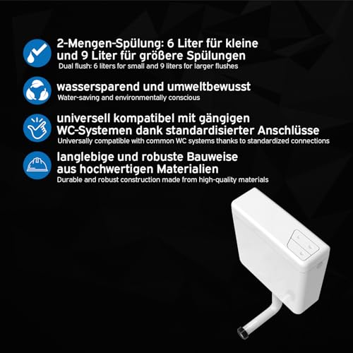 UNIVERSELLE KOMPATIBILITÄT: Der Toilettenspülkasten ist mit gängigen WC-Systemen kompatibel, dank standardisierten Anschlüssen und vielseitigem Zubehör.
