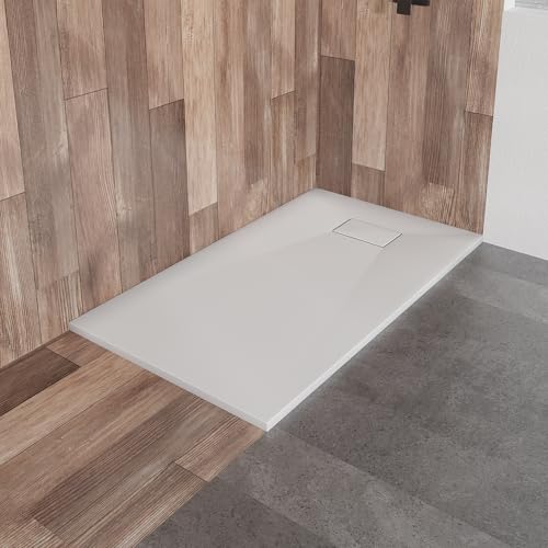 KOLMAN Duschwanne 170×90 cm Rechteck, Weiß, Komposit, Flach, Steinoptik, Ablaufgarnitur Ø 90 mm, Design-Duschtasse Rechteckig VIDAR SLIM