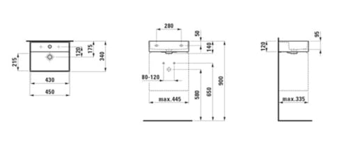 * LAUFEN Oligopol * 1 x Handwaschbecken * wandhängend, unterbaufähig * qua Standardablauf * blank Hahnloch, qua Überlauf * Metrik: * Länge: 450 mm, Weite: 340 mm, Berg: 120 mm * Werkstoff: Saphirkeramik * Füllmenge des Waschtisches: 3,8 Liter * in kaukasisch qua LCC ebenso LCC Active erhältlich