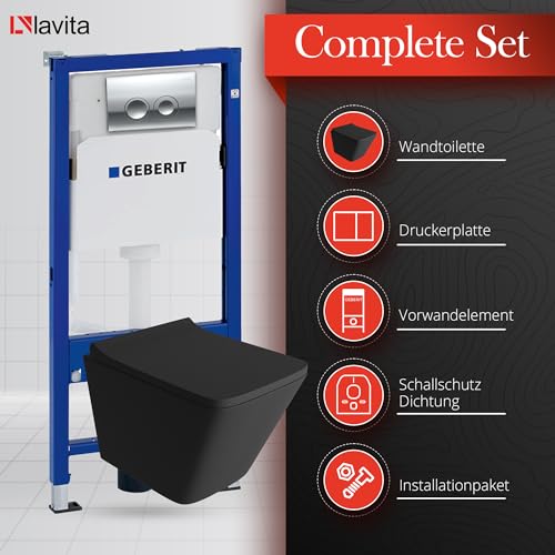 KOMPLETT-PAKET: Geberit Duofix Basic Vorwandelement + Wand-WC Tiefspül Lago Becken Schwarz Spülrandlos + Bedienplatte Delta 25 für Doppelspülung
