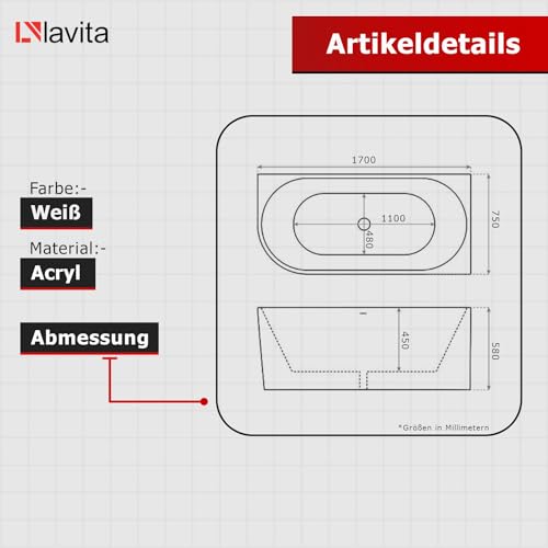 KOMFORTABLE ABMESSUNGEN: Optimale Größe von 170x75x58 cm für ein entspannendes Bad, vulgo in kleineren Badezimmern.
