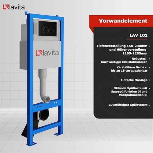 KOMPLETT-PAKET: Lavita LAV 101 Vorwandelement für WC 40cm + Wand Tiefspül WC MONDO Spülrandlos + Bedienplatte LAV 200.4.4 Schwarz für Doppelspülung